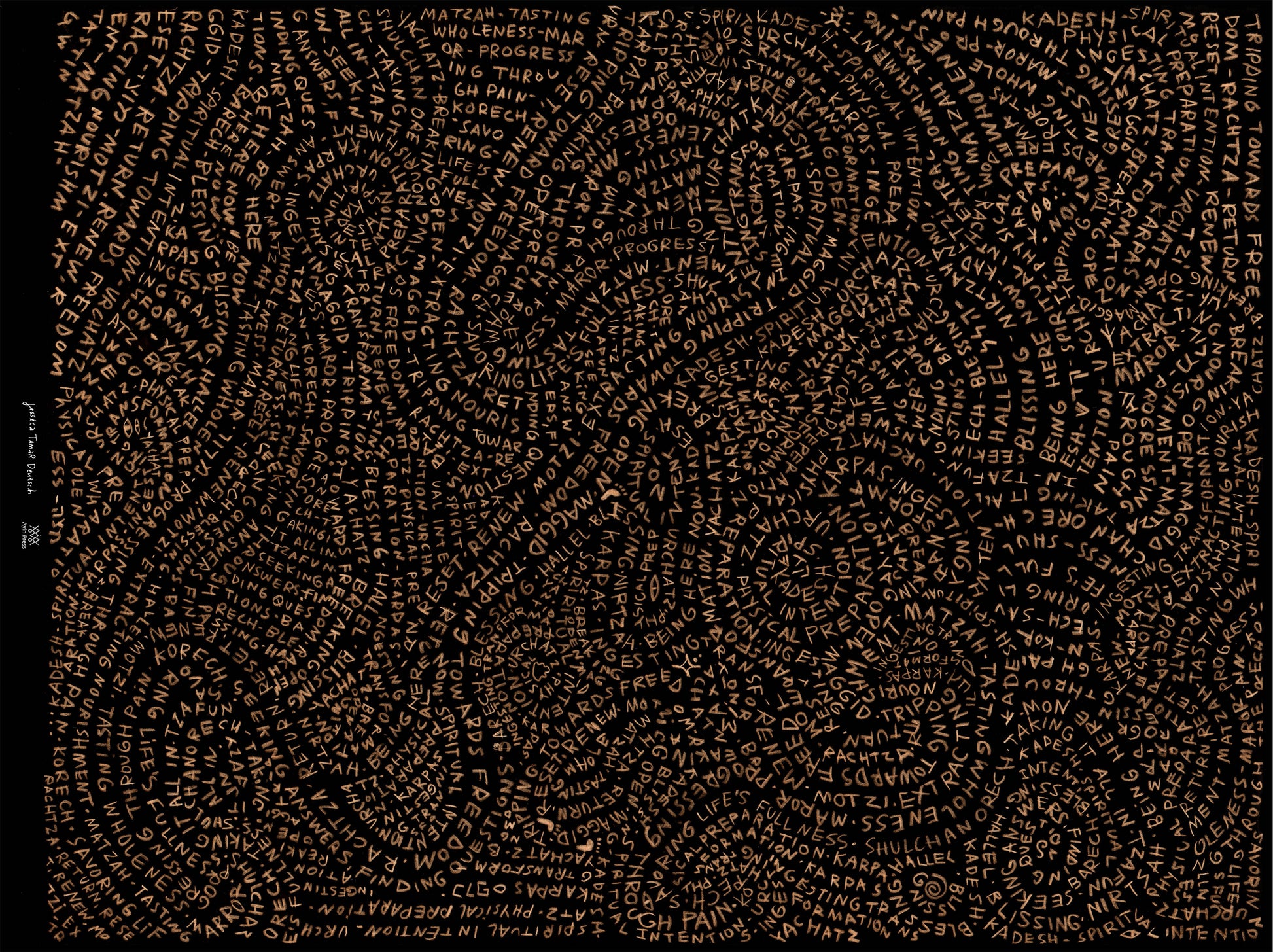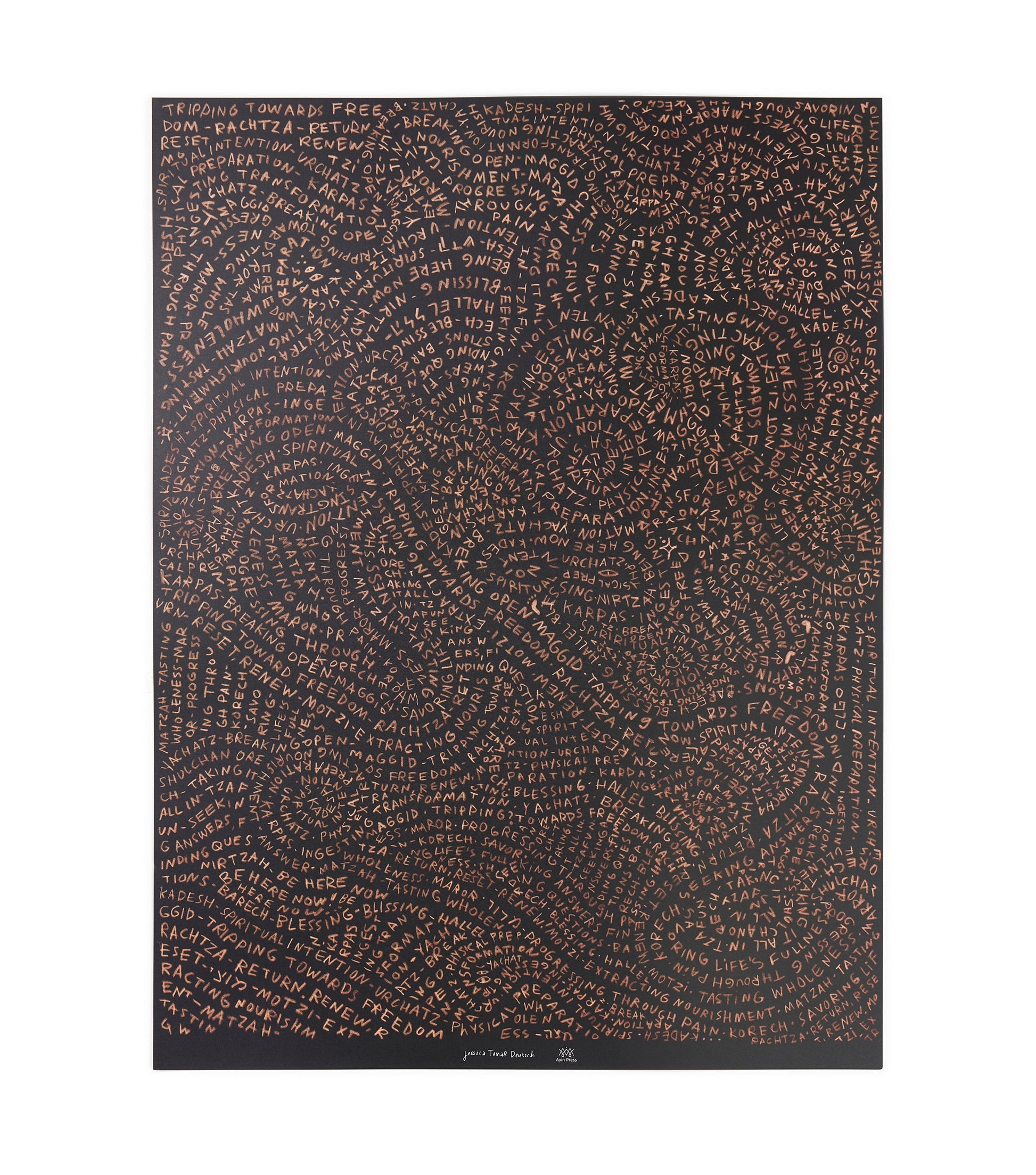 The poster is an abstract interpretation of Eden Pearlstein's Psychonautical Map of the seder experience, featured in Ayin's Psychedelic Pesach Zine. Jessica Tamar Deutsch draws mantras to create patterned text-based art. In this piece, she aimed to create a pattern resembling a topographical map of a the highs and lows of a spiritual journey toward liberation