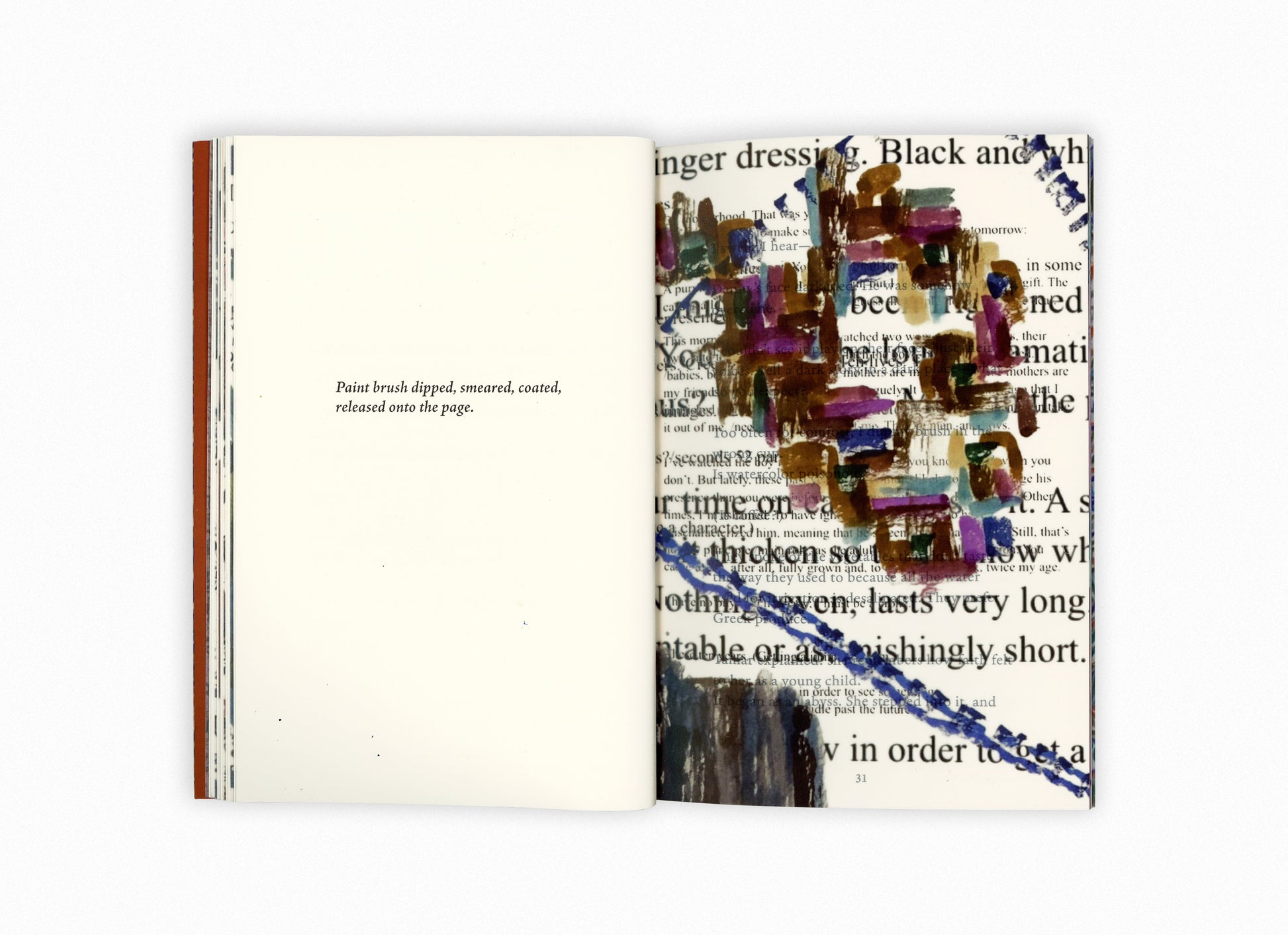 What remains is a work of fragments and flashes: a text that embodies the rhythm of the daily— food, humor, illness, reading, the sound of a child crying—and images with layered fields of color and half-concealed words.